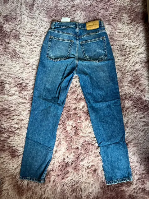 Jeans tipo mom fit con rasgado, de mezclilla azul, tiene bolsas frontales y traseras.