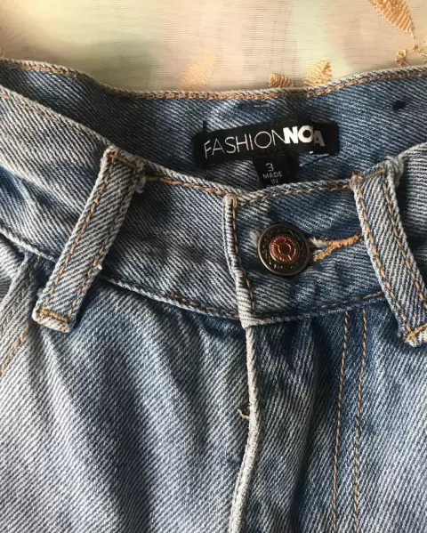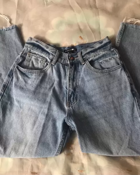 Mom Jeans Fashionnova 3. Mom jeans color azul claro, mezclilla gruesa, marcado como talla 3, 30cm cintura, 46cm cadera, 31cm tiro, de la parte de abajo simula estar deshilachado, amolda muy bien, sin detalles