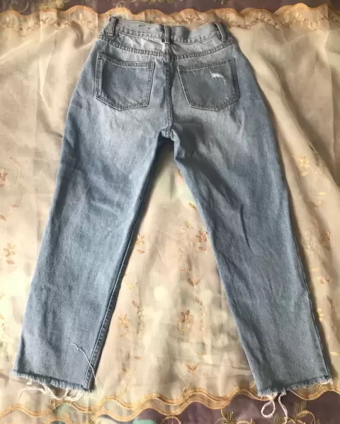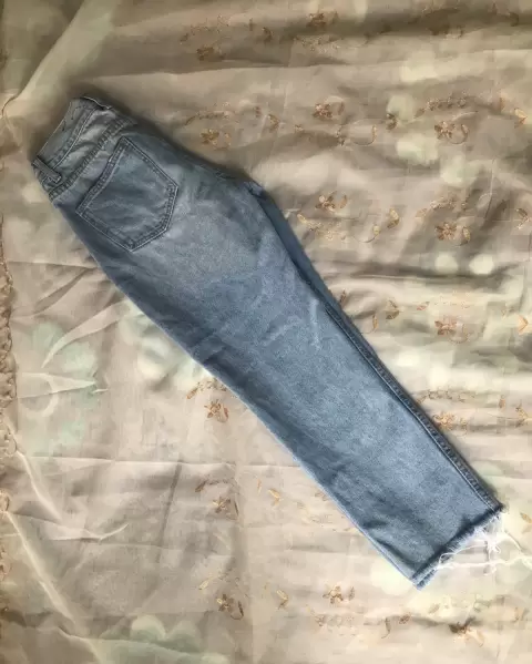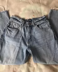 Mom jeans color azul claro, mezclilla gruesa, marcado como talla 3, 30cm cintura, 46cm cadera, 31cm tiro, de la parte de abajo simula estar deshilachado, amolda muy bien, sin detalles