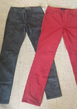 PACK DE JEANS NEGRO/ ROJO. Pack de jeans color negro talla (28) tiro alto/ (cintura.39/cadera 47/largo1.0) Spandex/ con etiquetaRojo/ de pana) talla (4)/ tiro alto/ cintura.37/cadera.47/ largo 1.7/ (nunca usado) marca TABLOTS