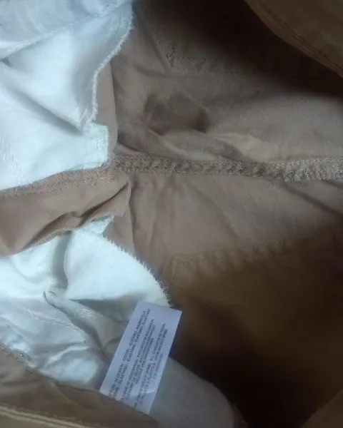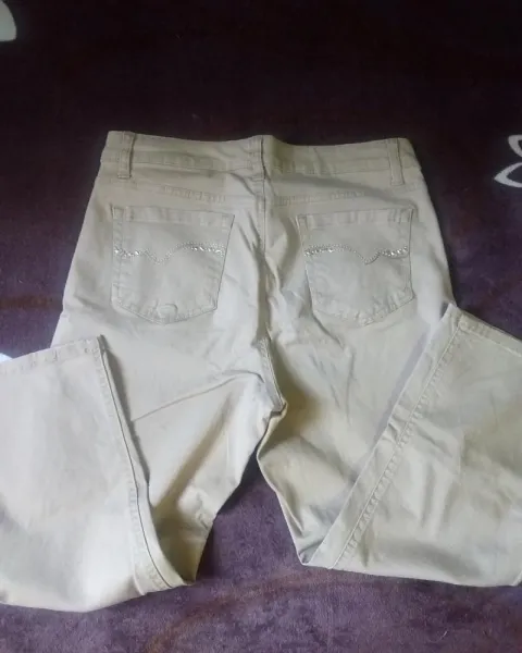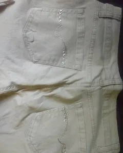 Pantalón Capri beige. Bonito jeans Capri tiro alto strech, con aplicaciones con brillo en las bolsas traseras, sin detalle