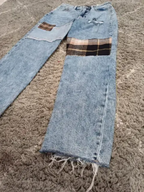 Pantalón con parches. Hermoso pantalón de mezclilla con parches y deshilachado. Simplemente bello 😍. Llega a los tobillos. Es tiro alto tipo mom jean.Medidas: cintura 32 cm, cadera 43 cm, largo 92 cm.