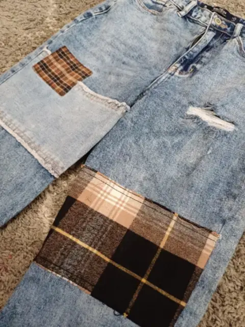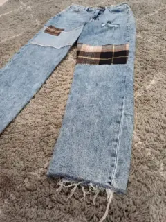 Hermoso pantalón de mezclilla con parches y deshilachado. Simplemente bello 😍. Llega a los tobillos. Es tiro alto tipo mom jean.Medidas: cintura 32 cm, cadera 43 cm, largo 92 cm.