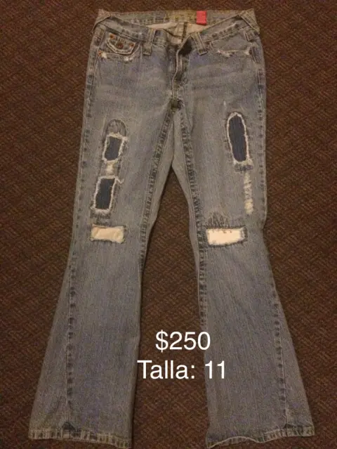 Pantalón de mezclilla. Pantalón de mezclilla con parches como adornos, color azul, las piernas tienen terminación rectas, bolsas en la parte de atrás, talla 11