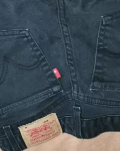 Pantalón de mezclilla acampanado. Es negro aunque se ha desgastado un poco el color, lo compre de medio uso pero no me quedó.Es de botones en la parte de adelante, es decir no tiene cierres. Tela de mezclilla gruesa, la talla quizá queda a una 5