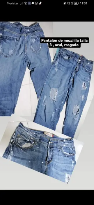 Pantalón de mezclilla azul, rasgado. Buen estado, pocas puestas, talla 7, bonito, es a la cadera