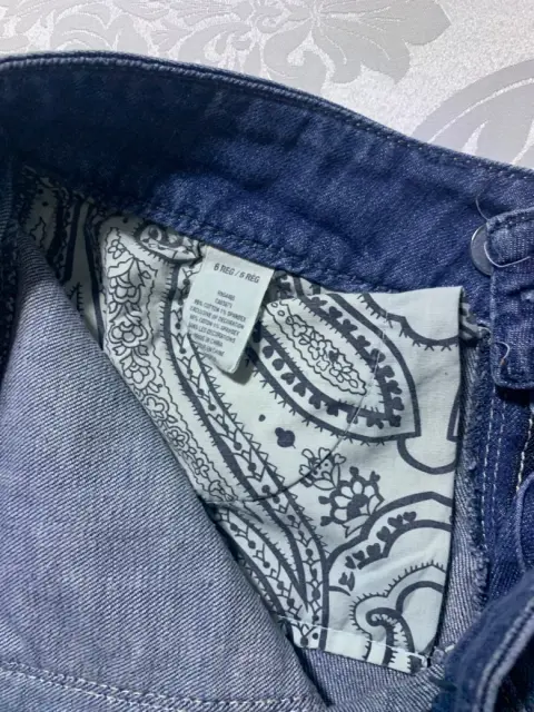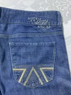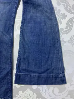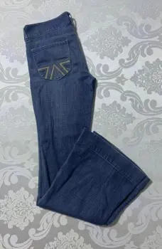 Pantalón de mezclilla sin strech, corte campana con bordados en las bolsas traseras.Medidas/ cintura: 40 cm, cadera: 46 cm, tiro: 23 cm, largo: 107 cm