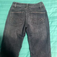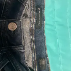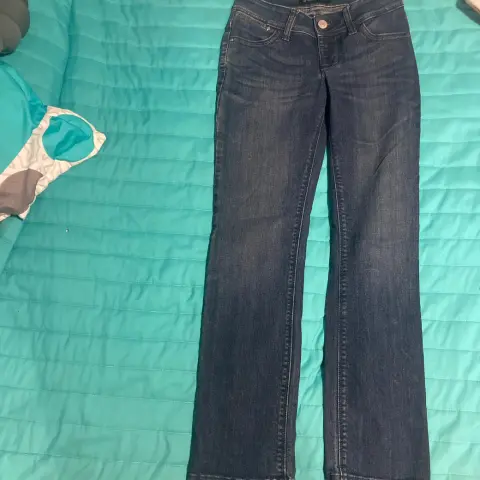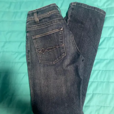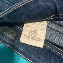 Mezclilla azul oscuro, ligeramente deslavado, Perfecto fit, straight leg. Talla 2 short.En perfecto estado, muy poco uso.