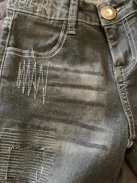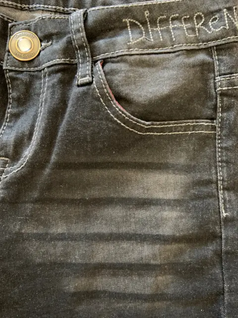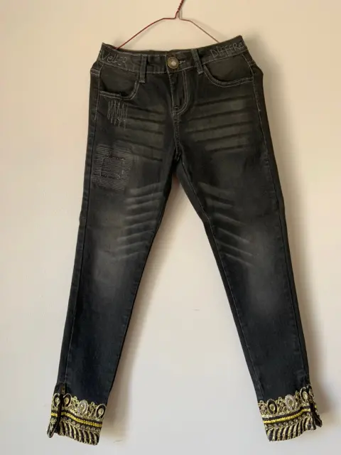 Pantalón de mezclilla marca Desigual. Pantalón color negro deslavado con bordados color dorado al final de la pierna, y detalles súper lindos a lo largo. talla 24 MX