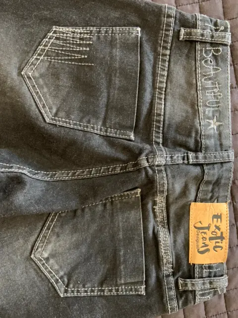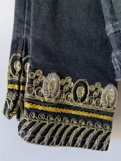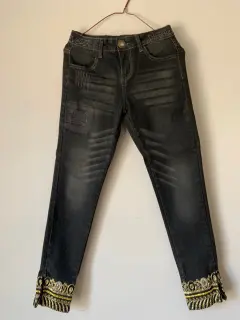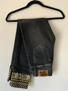 Pantalón color negro deslavado con bordados color dorado al final de la pierna, y detalles súper lindos a lo largo. talla 24 MX