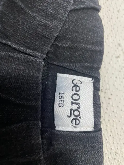Hermoso pantalón de tiro alto de mezclilla negro, con resorte en vez de cierre, solo tiene bolsillos traseros, talla 16EG de niña. Es nuevo.Cintura: 33cm. Largo: 65cm. No estira mucho.