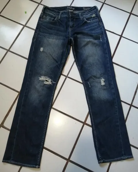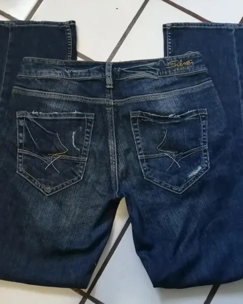 Bonito pantalón corte recto con rasgadas (traen tela no se ve la piel) bordado en bolsa traseras talla 27 (3/5)color azul fuerte