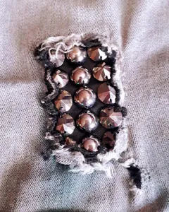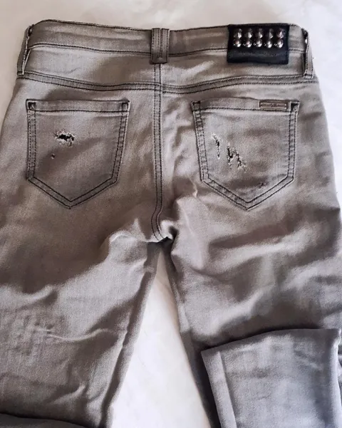 Pantalón GUESS Skinny gray. Pantalón Guess skinny con estoperoles, efecto deslavado. Cierre con botón y cremallera, con emblema metalizado en uno de los bolsillos. Corte straight crop, color gris deslavado.Queda de talla 3 a 4.