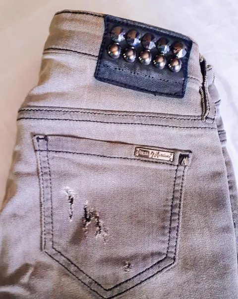 Pantalón Guess skinny con estoperoles, efecto deslavado. Cierre con botón y cremallera, con emblema metalizado en uno de los bolsillos. Corte straight crop, color gris deslavado.Queda de talla 3 a 4.