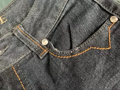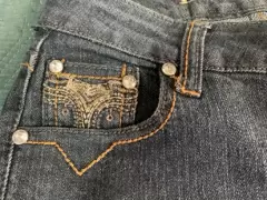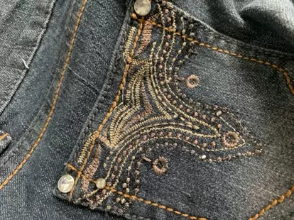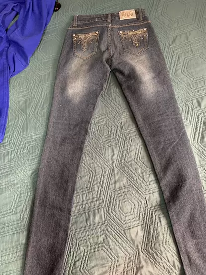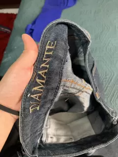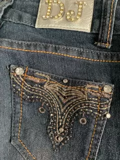 Pantalón de mezclilla con detalles de perlitas, es oscuro como degradado, chico, bonito
