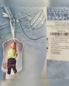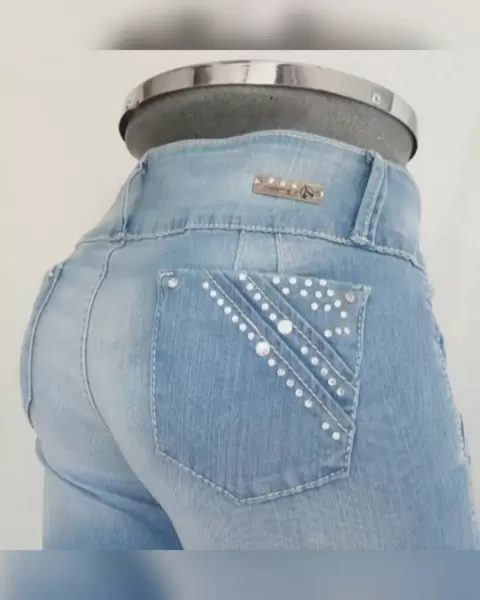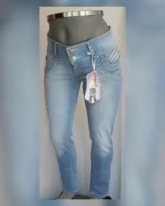 Pantalón mezclilla stretch tipo straight a la cadera, tono AZUL MUY CLARO DESLAVADO, pretina ancha c/trabillas, cierre p/cremallera baja y doble botonadura lacrada de fantasía, 2 mini bolsos frontales c/detalles bisutería blanca tornasol y botones de fantasía, 2 bolsos traseros c/detalles de bisutería blanca tornasol y botones de fantasía, y placa trasera c/logotipo de la marca tono plata patinada c/aplique de bisutería. Talla 9 (fiel a su talla). Dimensiones cms: 37.5 cintura, 21.5 tiro, 44.5 cadera, 23.5 pierna, 99 largo. 97% algodón, 3% elastano. Para lavado en casa.***Esta marca se especializa en elaborar jeans para chicas con curvas y dan un soporte espectacular a los glúteos sin aplastarlos.***