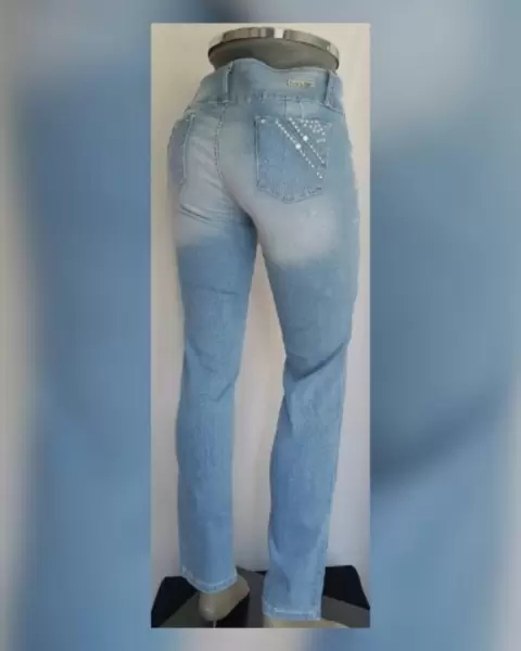 Pantalón Mezclilla estilo Straight Azul Claro. Pantalón mezclilla stretch tipo straight a la cadera, tono AZUL MUY CLARO DESLAVADO, pretina ancha c/trabillas, cierre p/cremallera baja y doble botonadura lacrada de fantasía, 2 mini bolsos frontales c/detalles bisutería blanca tornasol y botones de fantasía, 2 bolsos traseros c/detalles de bisutería blanca tornasol y botones de fantasía, y placa trasera c/logotipo de la marca tono plata patinada c/aplique de bisutería. Talla 9 (fiel a su talla). Dimensiones cms: 37.5 cintura, 21.5 tiro, 44.5 cadera, 23.5 pierna, 99 largo. 97% algodón, 3% elastano. Para lavado en casa.***Esta marca se especializa en elaborar jeans para chicas con curvas y dan un soporte espectacular a los glúteos sin aplastarlos.***