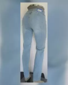 Pantalón Mezclilla estilo Straight Pretina A.. Pantalón mezclilla stretch tipo straight, cintura baja tono AZUL CLARO DESLAVADO, c/pretina alta c/trabillas, cierre p/cremallera baja y botonadura doble tono oro envejecido y 2 bolsillos frontales simulados. Talla 13 (MUY REDUCIDA, da mejor a 9). Dimensiones cms: 36.5 cintura, 22.5 tiro, 46 cadera, 23.5 pierna, 100.5 largo. 80% algodón, 18% poliéster, 2% elastano. P/lavado en casa.