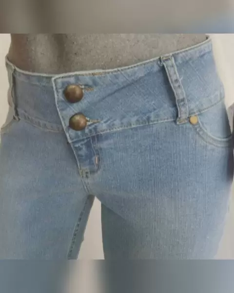 Pantalón mezclilla stretch tipo straight, cintura baja tono AZUL CLARO DESLAVADO, c/pretina alta c/trabillas, cierre p/cremallera baja y botonadura doble tono oro envejecido y 2 bolsillos frontales simulados. Talla 13 (MUY REDUCIDA, da mejor a 9). Dimensiones cms: 36.5 cintura, 22.5 tiro, 46 cadera, 23.5 pierna, 100.5 largo. 80% algodón, 18% poliéster, 2% elastano. P/lavado en casa.