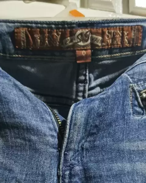 Talla 0 pantalón de mezclilla sexy jeans. Pantalon de mezclilla, deslavado., tiene cadena en el bolso derecho . Es una edición especial de sexy jeans Solo le falta en boton de enfrente.