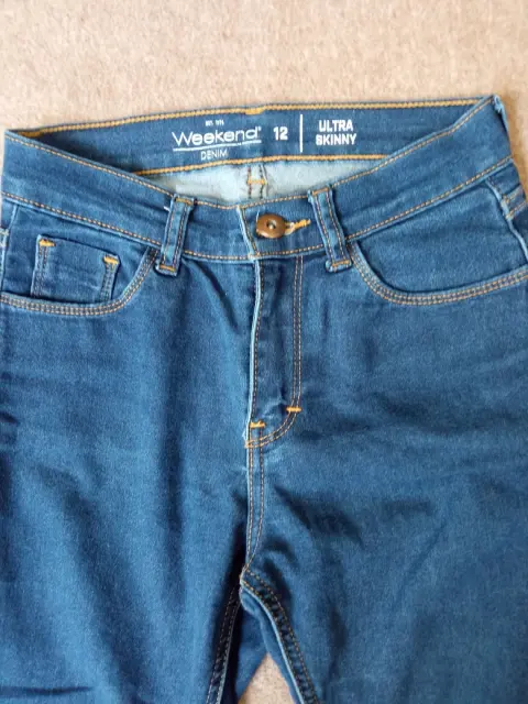 Jeans ultra skinny Weekend para niña , mezclilla azul marino, talla 12Medidas: 85 cm de largo, 58 cm de ancho en cintura, 76 cm de ancho en cadera.Medidas: 89 cm de largo, 64 cm de ancho en cintura, 80 cm de cadera. Usados en buen estado sin detalles.