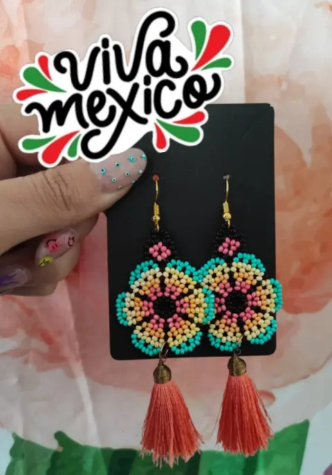2 por $200 🇲🇽 Aretes artesanales flor coral. *2 por $200 compra estos artes y llévate otro producto de mi muro con la misma promoción por $200 y aprovecha el envío gratis!!💚🤍❤️ Aretes artesanales de chaquiras hechos a mano, en forma de flores y pompones de hilo se seda, excelentes para lucir este 15 de septiembre 🎉Material chaquirasMedidas en imágenes Más modelos en mi clóset