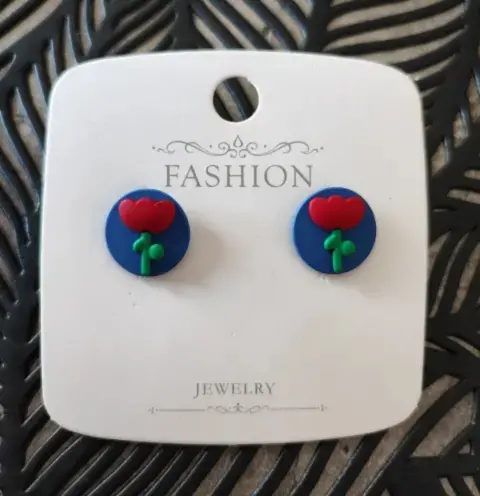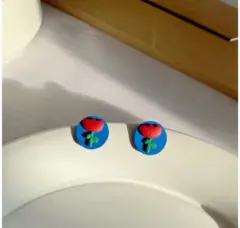 2 por $200 Aretes azules tulipanes rojos. *2 por $200 compra estos aretes y llévate otro producto de mi muro con la misma promoción por $200 y aprovecha el envío gratis!!*Aretes redondos azules con tulipanes rojos*Material resina*Medidas en imágenes