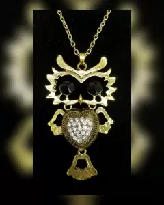 2x1 Collar Búho Dorado. Collar búho color DORADO ENVEJECIDO c/aplique de bisutería translúcida y negra y cadena bilbaina. Dimensiones cms: 36 largo cadena, 9x5 búho. Aleación de zinc.