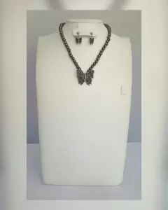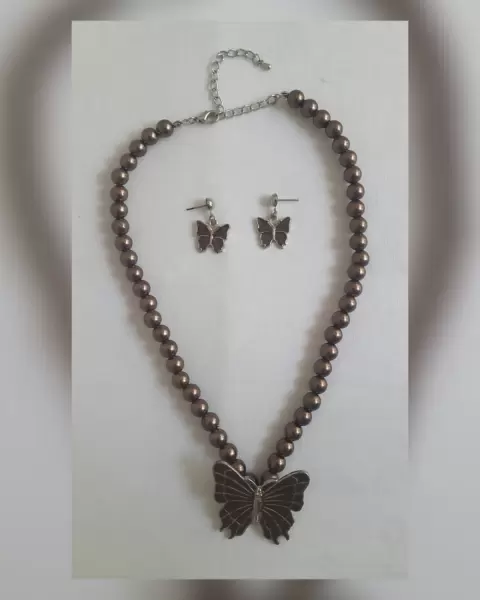 Gargantilla c/perlas de imitación tono TABACO c/dije de mariposa TABACO/PLATEADO.***INCLUYE ARETES A JUEGO***Dimensiones cms: 40 largo, 7 extensor, 5x5 dije, 1.5x1 aretes. Aleación de zinc.