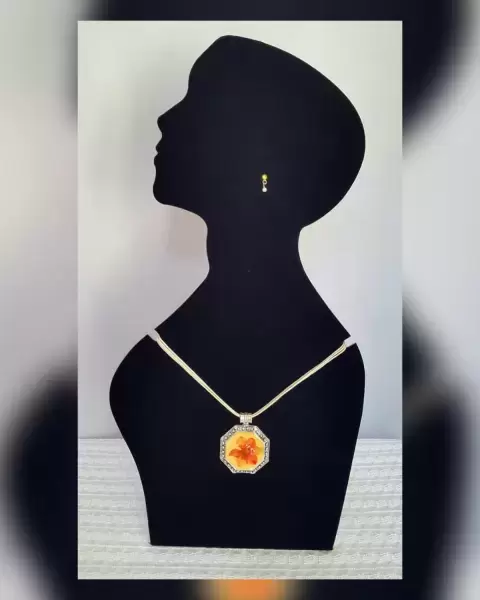 Gargantilla tiras fake fur tono CAPUCHINO c/dije de flor pintada a mano sobre metal.***INCLUYE ARETES A JUEGO***Dimensiones cms: 39 largo, 8 extensor, 6x5 dije, 1.5 aretes. Aleación de zinc y fake fur.