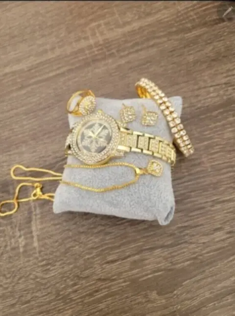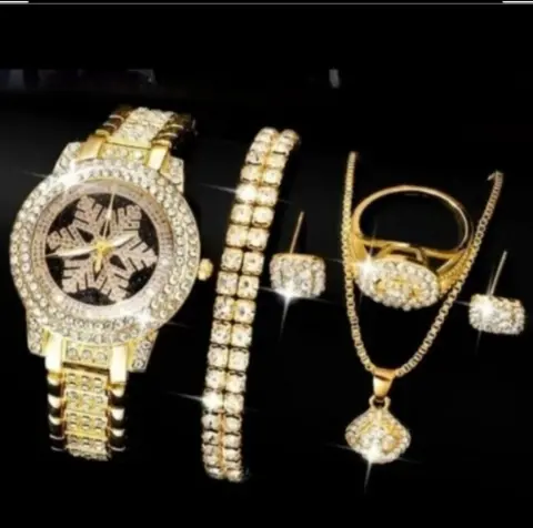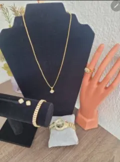 5-pcs Set de Relog y accessorios contiene 1.Anillo Dorado talla 8, 1. Pulcera de piedras, 1. Collar con dije 1. Par de aretes y un relog con exclusivo diseño en color dorado y negro ideal para ocasiones casuales o formales conbinalo con tus mejores atuendos para verte unica y atraer miradas