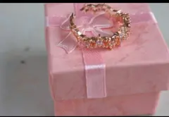 Hermoso anillo con incrustaciones de circonias, de color oro rosa. El anillo está hecho de acero inoxidable con chapado en oro. El anillo es ajustable.