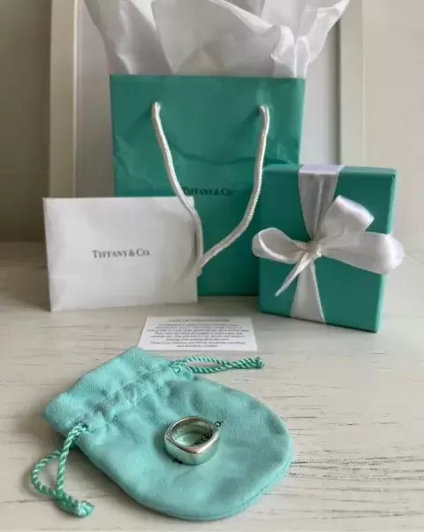 Anillo de plata Tiffany & Co. Talla: 5, peso: 11 gramos, ancho: 0.8 mm, se envía con todo lo que se ve en la foto.