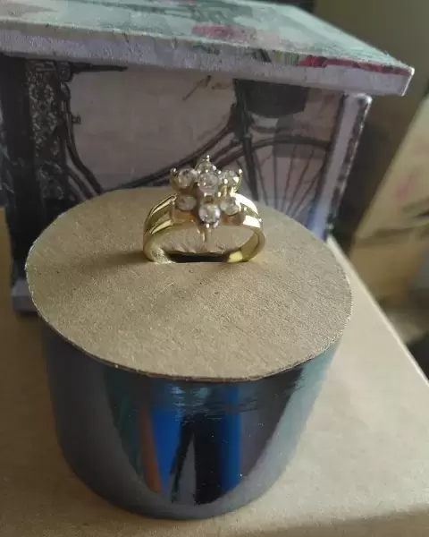 Lindo anillo en forma de flor y siete piedras. Anillo de piedras sintéticas color cristal, bañado en oro. No. 5. Mide 15 mm de diámetro. Ideal para regalo de aniversario, cumpleaños, graduación u ocasion especial. 💍Si te gusta otro artículo de mi clóset, te puedo armar un paquete!!