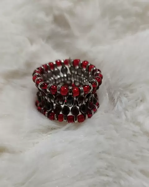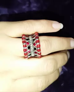 3 lindos anillos de bisutería de gama media, el negro es con baño de chapa de oro y esmaltado (muy parecido a un huevito con flor, corazón y mariposa), el anillo rojo es elástico y de cuentas de metal (diseño muy original); el último de las fotografías es de chapa de oro con cristales zirconia de laboratorio.