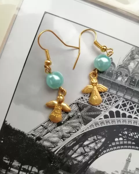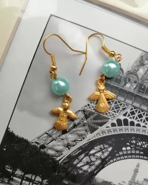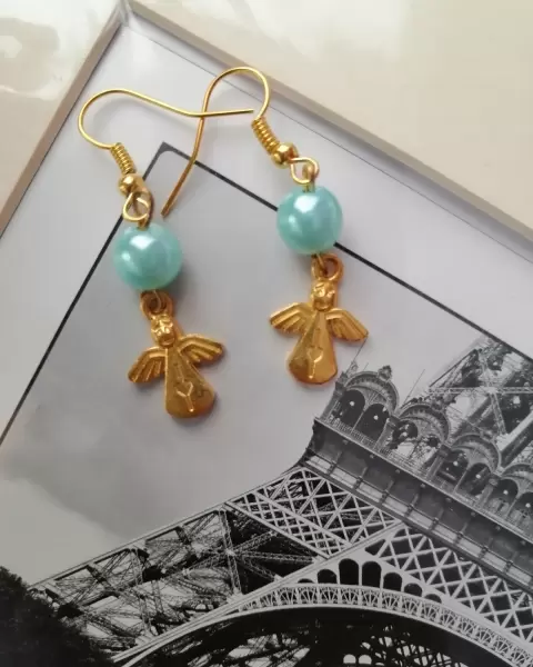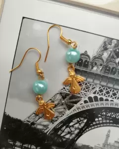 Aretes de ángel color aqua. Bonitos aretes de ángel con perla color verde aqua, marca coqueta, listos para que los estrenes