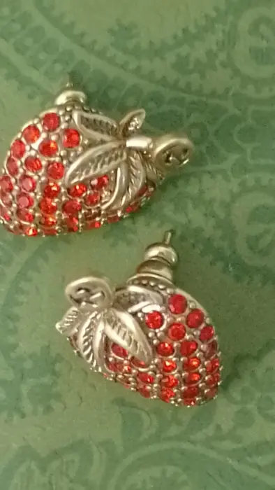 Aretes de fresa. Fresitas de broquel con broche de mariposa y zirconias rojas, miden 1.5 cm