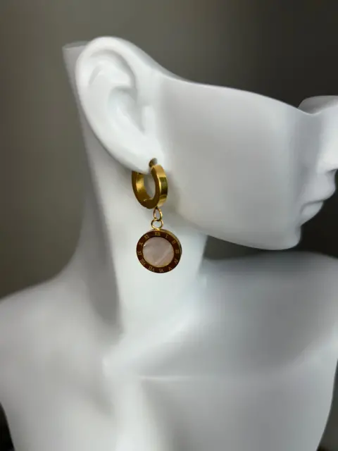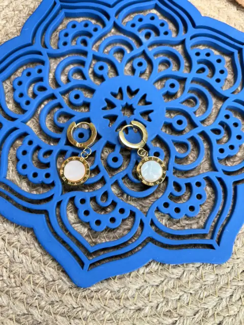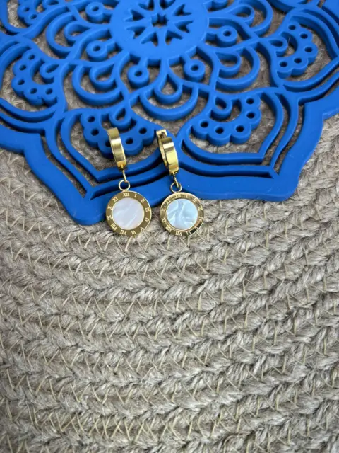 Aretes dorados con madre perla, números romanos. Envío sábados tal vez antes. No hago intercambios ni apartados. Acepto ofertas justas y de compra inmediata.