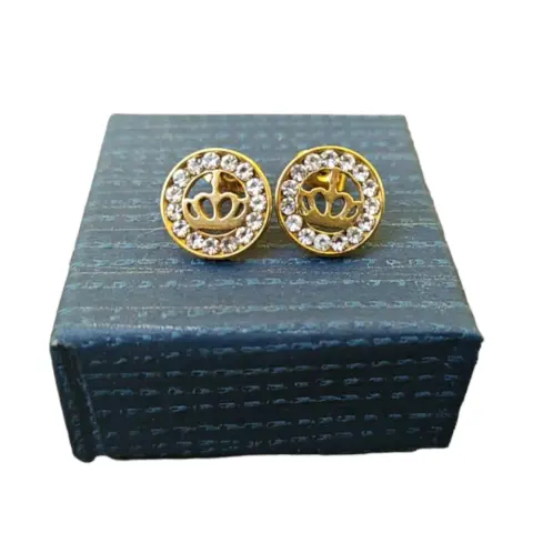 Aretes dorados de acero inoxidable forma de corona. Hermosos aretes dorados de acero inoxidable con aplicaciones de piedras brillosas, no se manchan, no se oxidan y no se rayan. Completamente nuevos.Si te agrada alguna otra prenda de mi clóset, podemos negociar el precio.