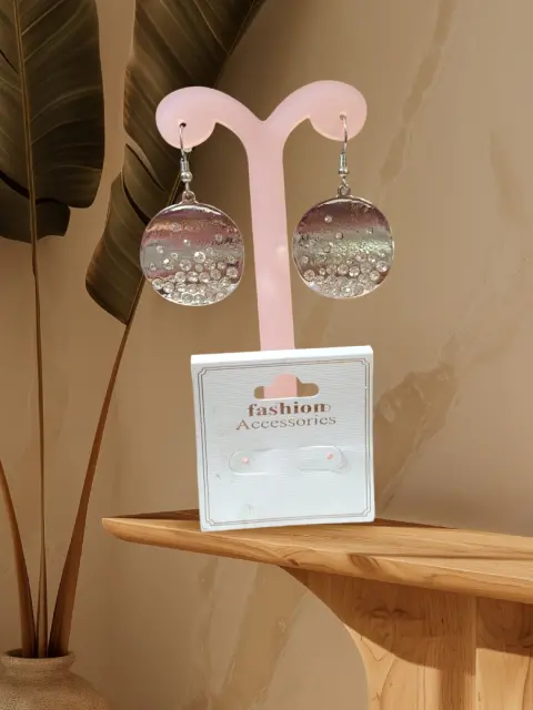 Aretes Fashion Accessories, color plateado, cierre de precion, forma redonda con piedritas blancas, tamaño mediano nuevo a estrenar con etiqueta