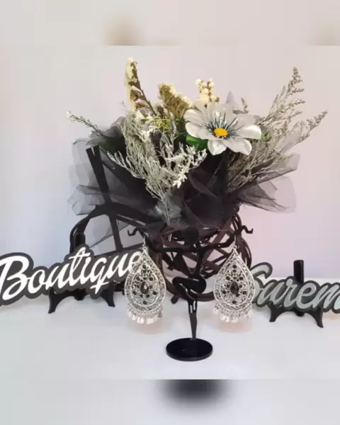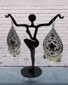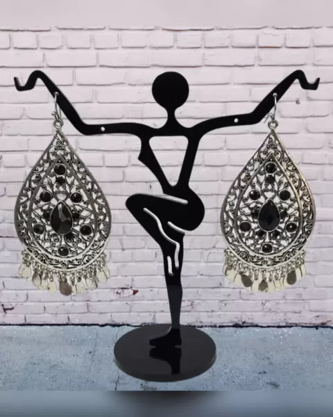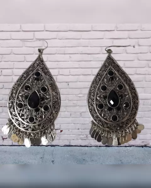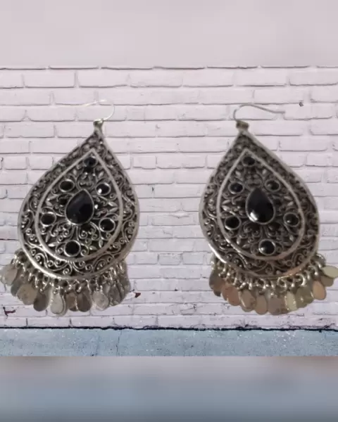 Aretes estilo boho en acero inoxidable tono PLATA ENVEJECIDA en forma de gota c/aplique bisutería color NEGRO ÉBANO y cierre gancho. Dimensiones cms: 7.5 largo, 4 ancho. Acero inoxidable.