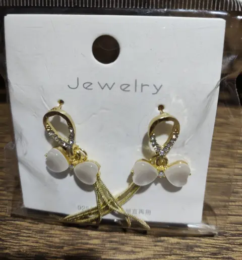Los aretes son largos en tono dorado, con detalles de pedrería aperlado, están súper lindos. Envío inmediato ☺️