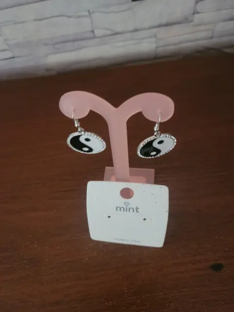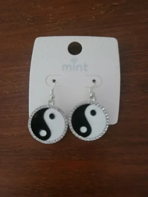 Aretes Mint Fashion wingyang. Aretes Mint Fashion wingyang, color blanco y negro con orilla de piedras brillosas y forma redonda que representa Paz y amor, con cierre de hook y precion, hechos de metal inoxidable, miden 2cm de diametro con 4.5cm de largo, nuevos a estrenar en buen estado cosmetico.