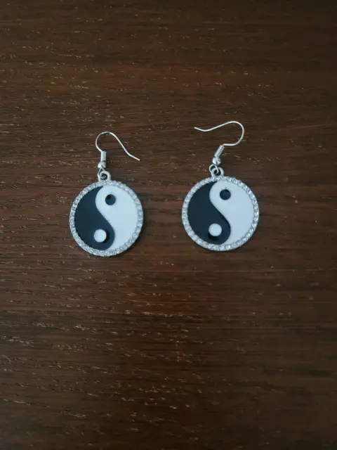 Aretes Mint Fashion wingyang, color blanco y negro con orilla de piedras brillosas y forma redonda que representa Paz y amor, con cierre de hook y precion, hechos de metal inoxidable, miden 2cm de diametro con 4.5cm de largo, nuevos a estrenar en buen estado cosmetico.