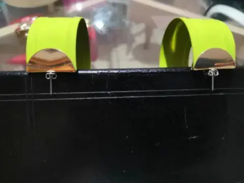 Aretes verde pistache, tiene 6cm de largo y 3 de ancho, sin detalles el material del arete es metálico recubierto con goma