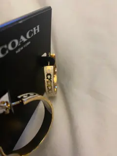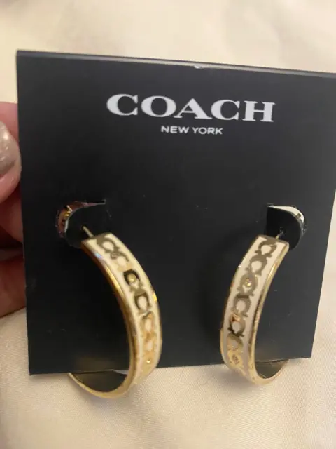 Arracadas Coach beige con dorado nuevas. Súper lindas, elegantes y modernas arracadas Coach doradas con logo sobre fondo beige que te harán lucir todos tus outfits con mucha clase