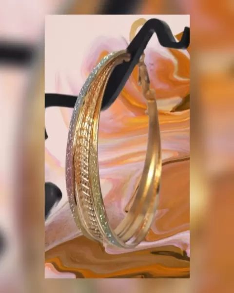 Arracadas Triples Oro Laminado. Arracadas triples en oro laminado color DORADO c/diseño veneciano efecto diamantado tonos AZUL/ROSA/AMARILLO/VERDE y cierre omega. Dimensiones cms: 5 circunferencia.***20 micras de oro 14 kilates adheridas a presión, calor y laser sobre metal (cobre o latón). El peso en oro de una pieza en oro laminado, corresponde a 1/20o de su peso total, o sea, un 5% oro.***