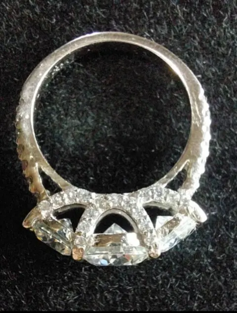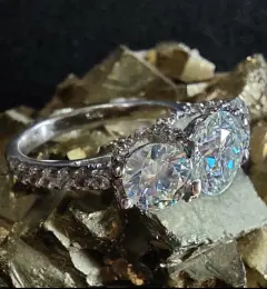 Fabricado en plata 925 con 3 baños (rodio, platino y oro blanco 18k)3 Moissanitas corte redondo, color D, claridad VVS1.Circonias corte redondo color transparente AAAATalla 7.5Todos mis anillos moissanita pasan la prueba de diamante