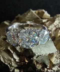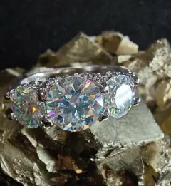 Bello anillo de moissanita. Fabricado en plata 925 con 3 baños (rodio, platino y oro blanco 18k)3 Moissanitas corte redondo, color D, claridad VVS1.Circonias corte redondo color transparente AAAATalla 7.5Todos mis anillos moissanita pasan la prueba de diamante