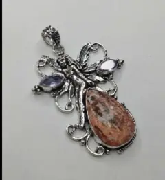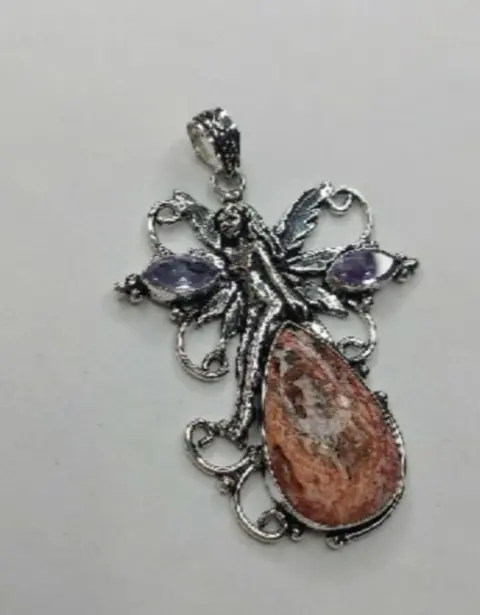 Bello dije de Hada. Fabricada en plata ley 925, amatista y jaspe piel de leopardo.Medida 3pulgadas.Los jaspes son piedras indicadas para energizar el cuerpo y aportarle fuerza y vitalidad. También se asocian a la limpieza, a la protección.La amatista es una piedra meditativa y calmante que trabaja en los planos emocional, espiritual y físico para promover la calma, el equilibrio y la paz.